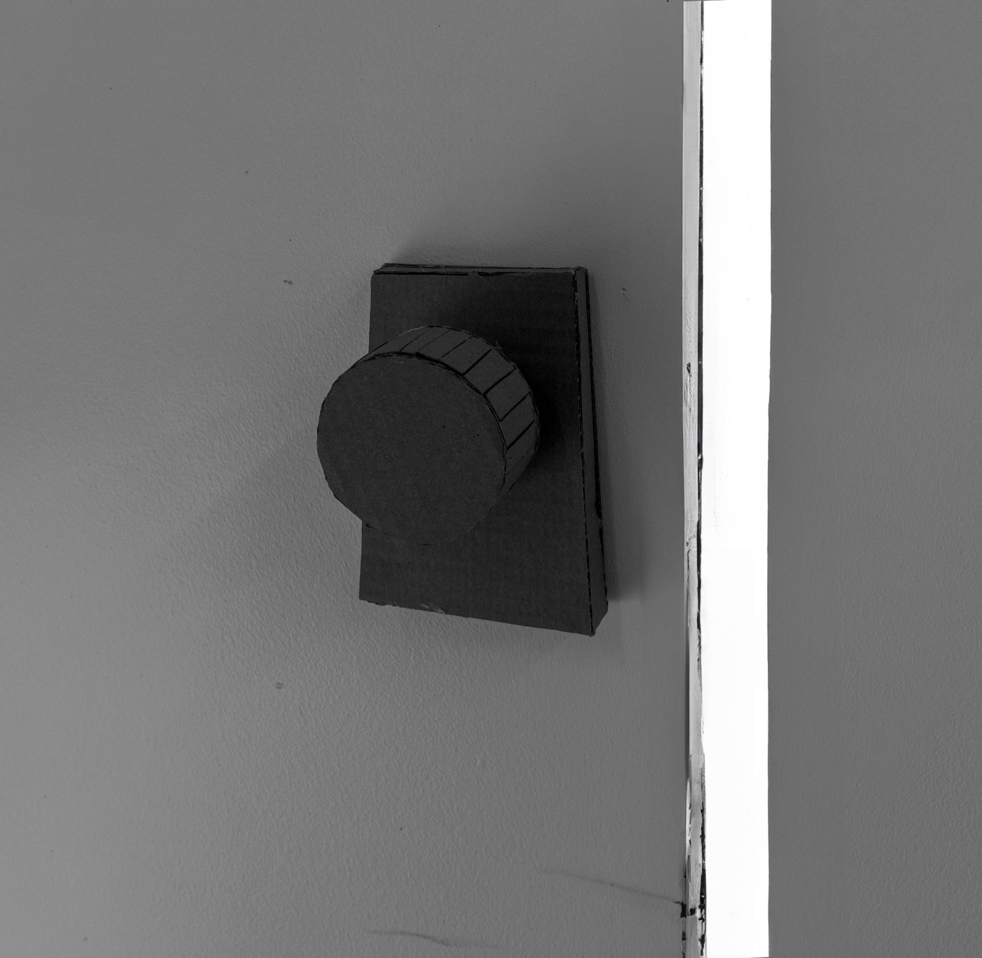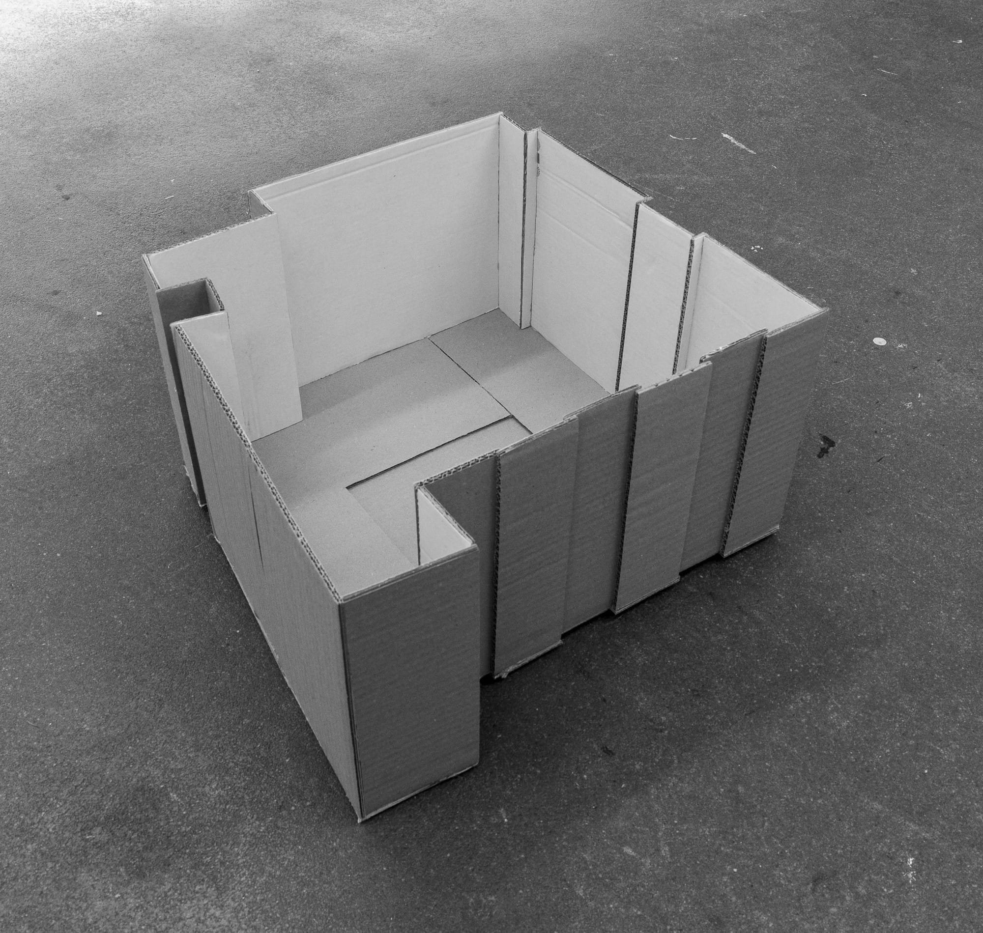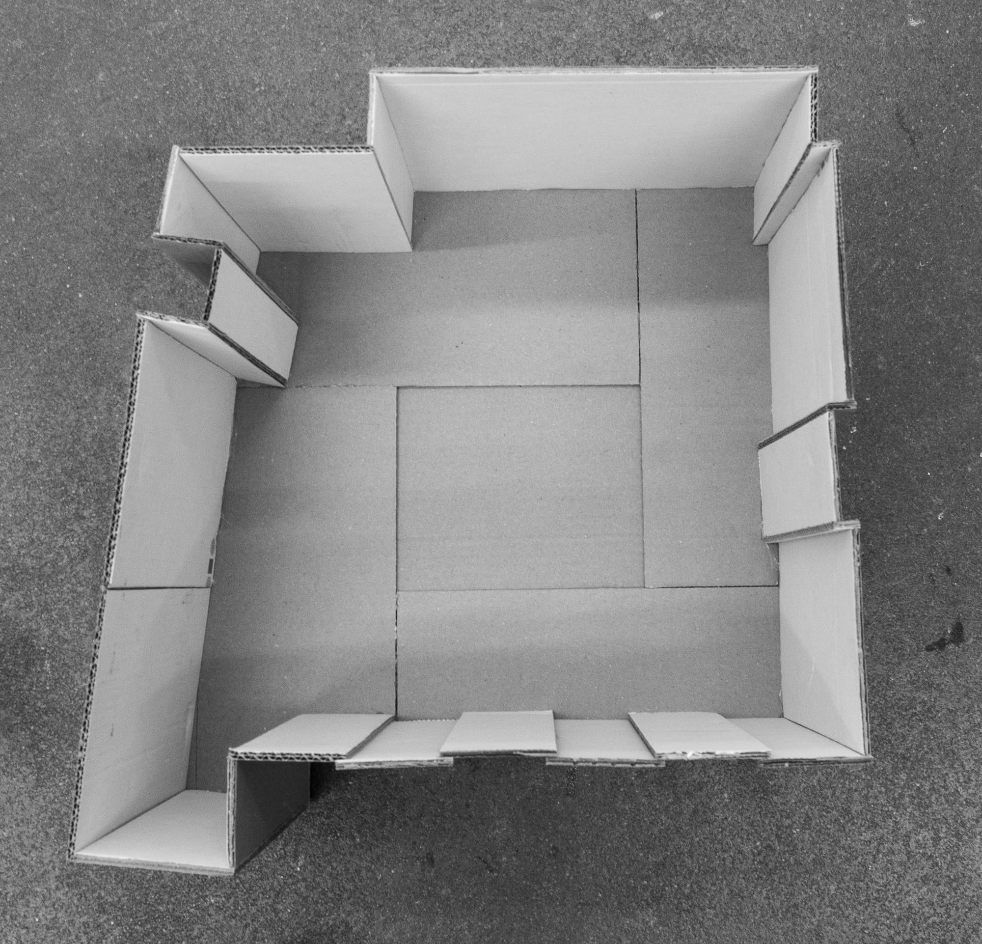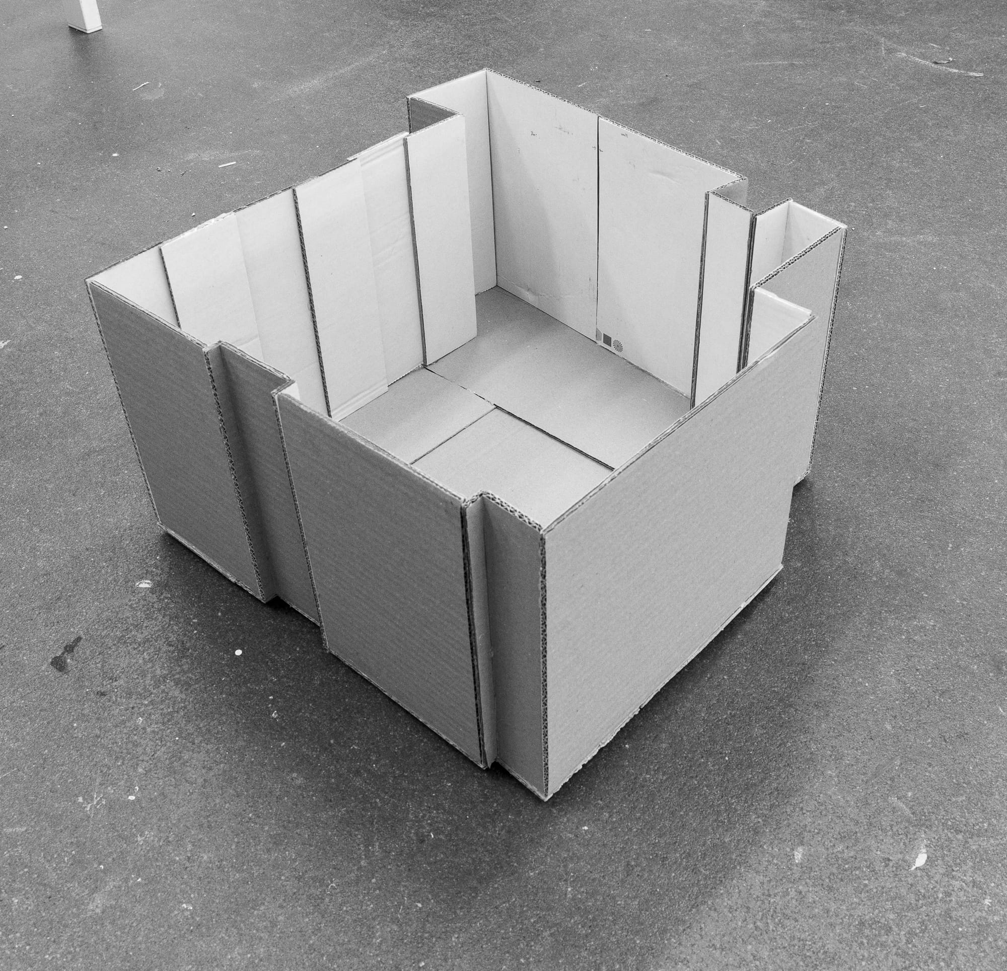 I decided to press into that emotional space with some sort of process, I began with an attempt at cognitive mapping: an initial survey of the room, I measured what i could reach and made a floor plan, then a fabrication (I bought in cardboard and a glue-gun). A version of the room which could encountered as outside from the inside. That externalisation mattered. It turned the space into an object and made perception something I could hold, move, manipulate and re-enter, more importantly I could imagine.